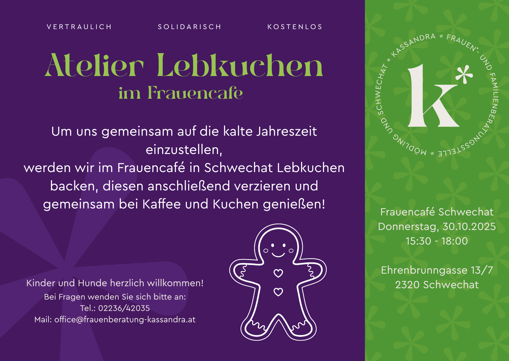 Um uns gemeinsam auf die kalten Jahreszeit einzustellen, werden wir im Frauencafé in Schwechat Lebkuchen backen, diesen gemeinsam verzieren und anschließend bei Kaffee und Kuchen genießen!